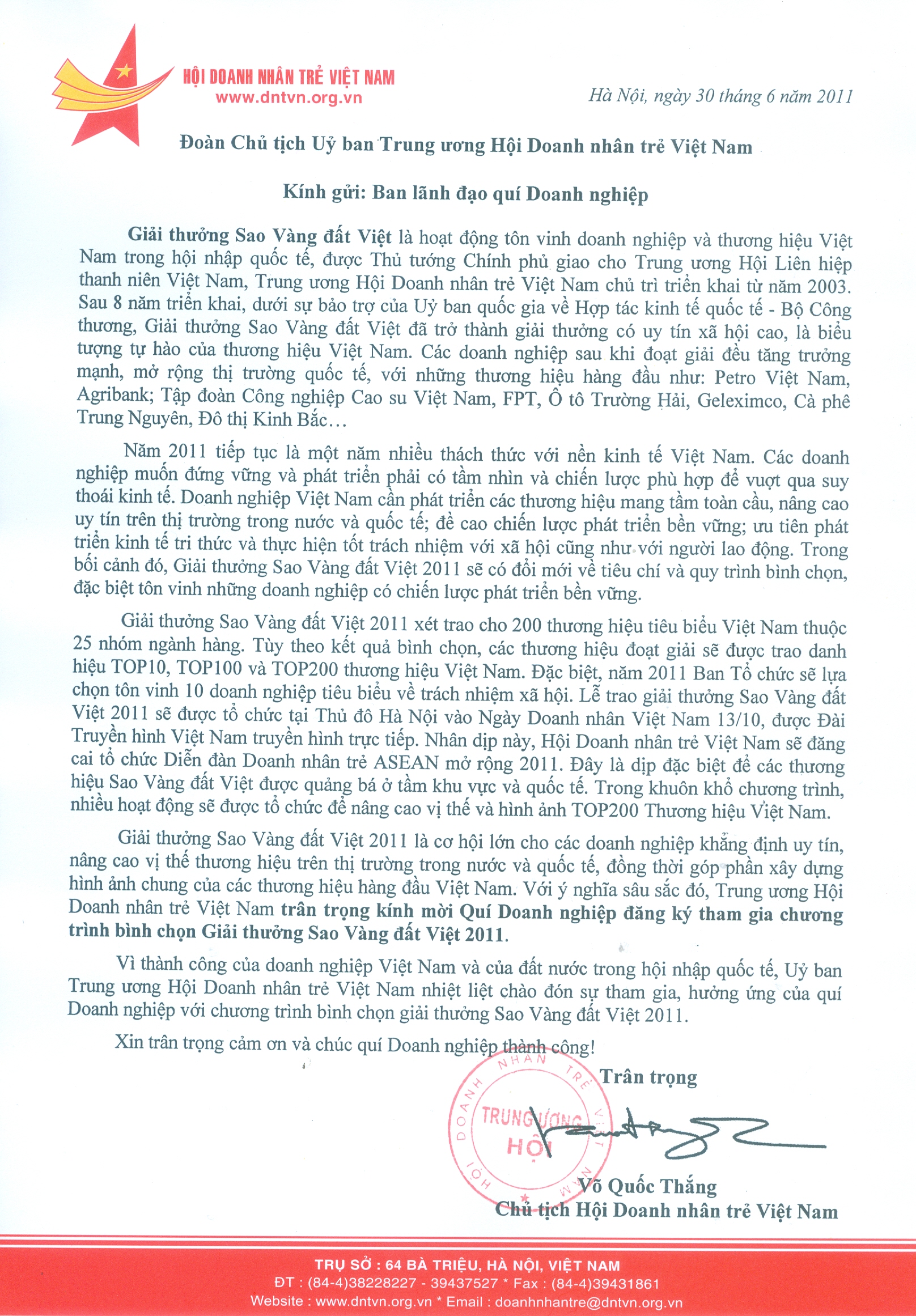 UBTƯ Hội DNT Việt Nam trân trọng đề nghị Quý Hiệp hội phối hợp lựa chọn giới thiệu các thương hiệu tiêu biểu của Hiệp hội để xét trao Giải thưởng Sao Vàng đất Việt 2011 cụ thể như sau: