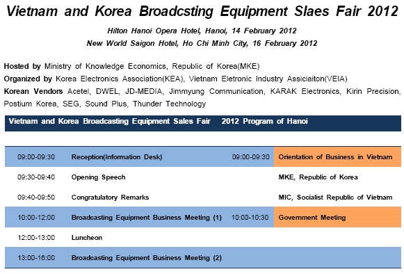 Tham dự đoàn Hàn quốc gồm 10 Công ty sản xuất-thương mại (vendors) sang Việt Nam, bao gồm 6 công ty trong lĩnh vực thiết bị âm thanh/camera và 4 công ty phát thanh/truyền hình v.v. Dự kiến chương trình sẽ tiến hành ở Hà Nội (14/2) và TP Hồ Chí Minh (16/2) do VEIA và KEA/KOBEC tổ chức. Các doanh nghiệp Việt nam ở khu vực Hà nội và TP HCM có thể tìm hiểu và đăng ký tham gia cuộc gặp gỡ này với VPHH VEI tại Hà Nội (và TP HCM): 11B Phan Huy Chú, Hoàn Kiếm, Hà Nội. Tel: (84-4) 39332845 Fax: (84-4) 39332846 - email: hiephoidientu@gmail.com, hiephoidientu2@gmail.com.