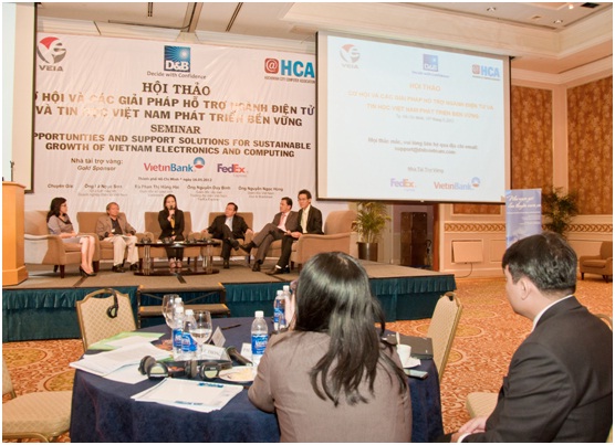 Bà Phan Thị Hồng Hải – Giám đốc Sở giao dịch của Ngân hàng ViettinBank đã chia sẻ những kinh nghiệm quý báu và “xương máu” trong quá trình hỗ trợ doanh nghiệp xuất khẩu sang thị trường nước ngoài qua bài phát biểu “Giải pháp tài trợ thương mại chuyên biệt cho doanh nghiệp điện tử và tin học” thông qua đó bà đã giới thiệu các dịch vụ và sản phẩm tài trợ thương mại của ngân hàng ViettinBank. Bà cho biết các doanh nghiệp muốn vay vốn từ ngân hàng để làm hàng xuất khẩu, ngân hàng thường xem xét hai yếu tố chính đó là hiệu quả kinh tế và tính khả thi của các hợp đồng xuất khẩu. Điều đó có nghĩa là hợp đồng kinh tế phải có thực, không có những điều khoản dễ xẩy ra tranh chấp, hai bên mua và bán có đầy đủ năng lực thực hiện hợp đồng, hợp đồng phải mang lại lợi nhuận cao và ngân hàng có kiểm soát được dòng tiền để thu nợ. Bên cạnh đó mấu chốt cơ bản để DN Điện tử có thể có động lực và nền tảng khai thác được các thị trường mới và nhạy cảm là sự hỗ trợ trong vấn đề thanh toán từ phía các tổ chức tín dụng lớn. Một cơ chế tín dụng tài trợ và thanh toán hợp lý cho các DN SMEs ngành điện tử sẽ giúp các DN này có hy vọng vượt qua những hạn chế hiện thời và sớm gia tăng giá trị trong tổng giá trị kim ngạch xuất khẩu của toàn ngành.