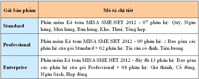 Các gói sản phẩm của MISA SME.NET 2012